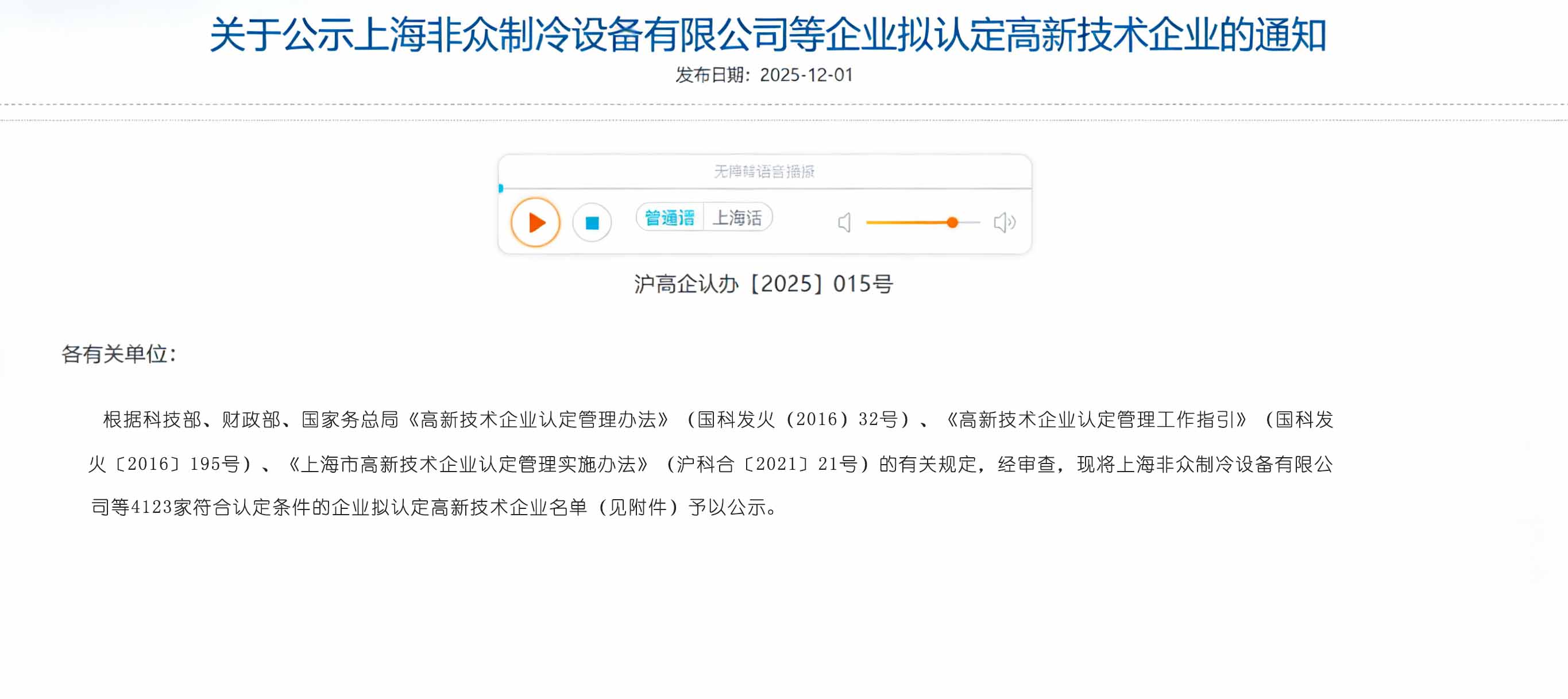 近日,根據科技部、財政部、國家稅務總局《高新技術企業認定管理辦法》(國科發火〔2016〕32號)、《高新技術企業認定管理工作指引》(國科發火〔2016〕195號)、《上海市高新技術企業認定管理實施辦法》(滬科合〔2021〕21號)的有關規定,經審查,現將上海非眾制冷設備有限公司等4123家符合認定條件的企業擬認定高新技術企業名單(見附件)予以公示。