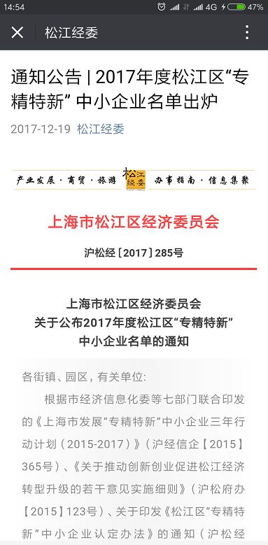 上海ZHONGYOU眾有上榜2017年度松江區“專精特新”中小企業名單