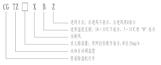 1. CGTZ60X:表示名義除濕量為60kg/h,進(jìn)風(fēng)方式為右進(jìn)風(fēng),適用溫度范圍為18℃~35℃的全新風(fēng)水冷自動調(diào)溫型管道除濕機(jī)